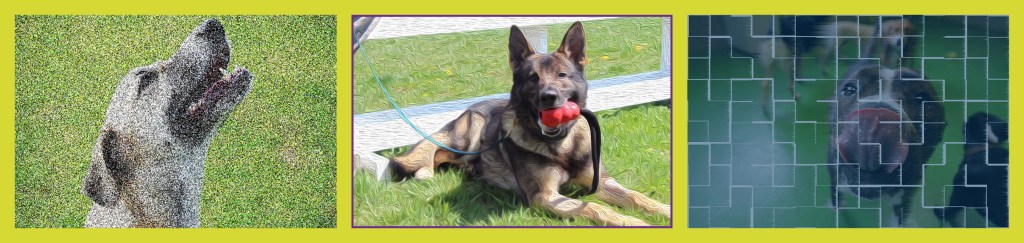For this week, I had to make set up 3 altered images in one file for my visual design class. For this assignment, I didn’t have any specific design considerations or methods in mind. I randomly just came up with the idea to use dogs. The one specific principle I chose to include was the idea of ethics we learned about in class. I made sure to pick pictures that I knew had the labeled for use with modification sign on it. With this being an introductory assignment, I treated it as an opportunity to experiment with different features on Photoshop that I had not yet explored. I played for a bit until I found 3 unique effects that I could use to make my selected photos look like art. For the leftmost photo, I used the pointillize feature then messed around with the brightness a bit. For the center picture, I gave it a purple frame and I distorted it to look more like a painting using filters. For the picture on the right, I applied a blue fill with low opacity as well as a tile filter. As for the dimensions, the canvas is 34.5 inches wide and 8.2 inches tall. The pixel sizing is 2488 x 592 with a resolution of 72 pixels per inch.