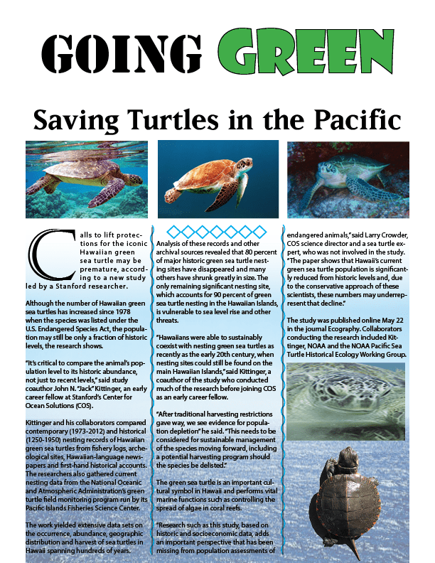 For this assignment, I created the single page turtle article by following the video for technical guidance while also using my own creative freedom to make it look more like I made it myself. Simple things like making the word Green in the title the color green with large text is an example of this. The diamonds and the squiggly lines were also creative aspects of it that came from my own personal vision. Because I don’t like it when words are slanted all over the place since I find it hard to follow, I put all of the pictures in places where they would have good spacing while also not having them interfere with the text.